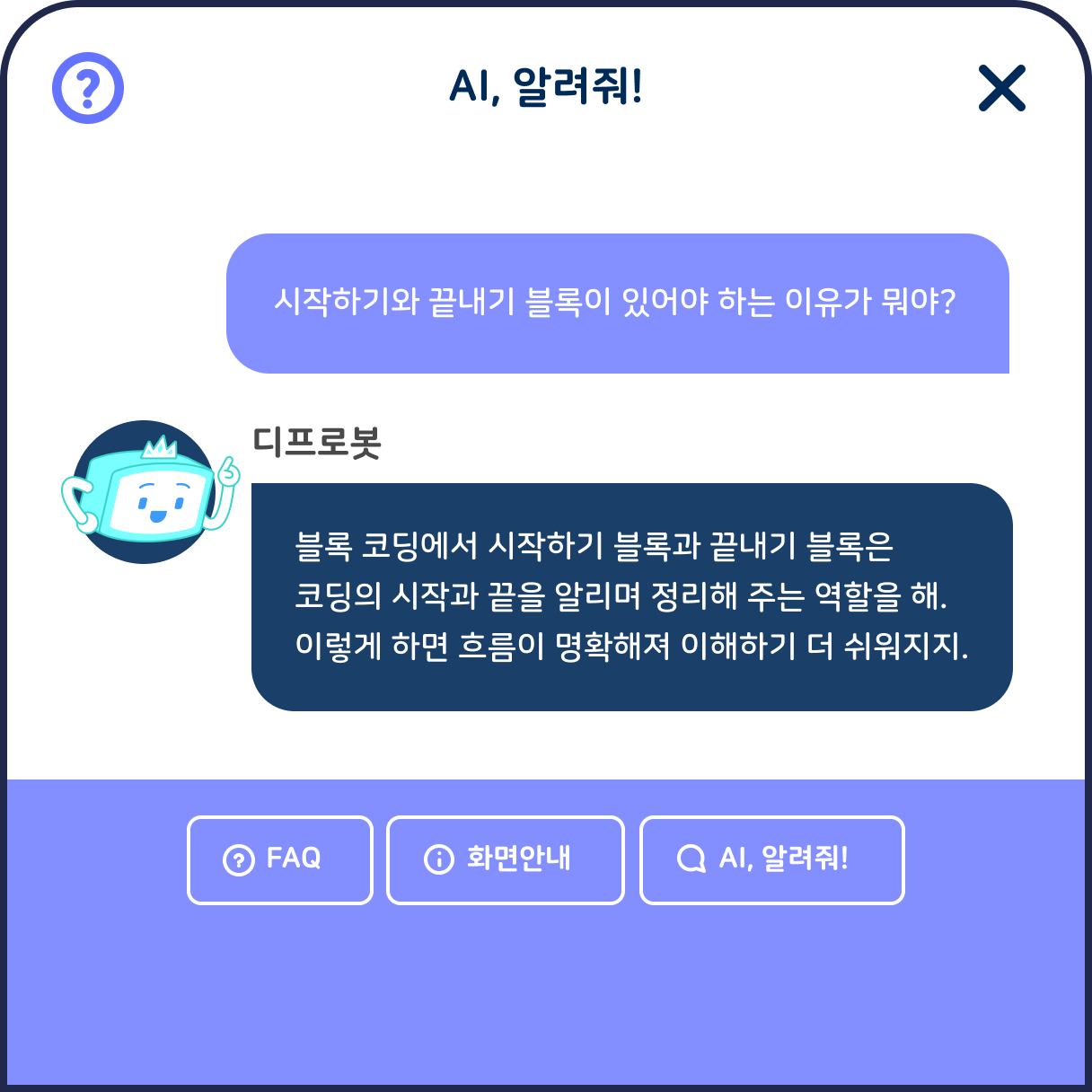 예를 들어, 큰 재활용 쓰레기를 수집하는 게임을 할 때 필요한 합치기 버튼의 경우에는 1. 나와 친구의 수거 드론을 가운데로 보내고 2. 나와 친구의 수거 드론을 합치는 코드가 필요합니다. 이때 어떤 블록으로 코드를 만들어야 하는지 암시가 제공되므로 쉽게 코드를 완성할 수 있습니다.
